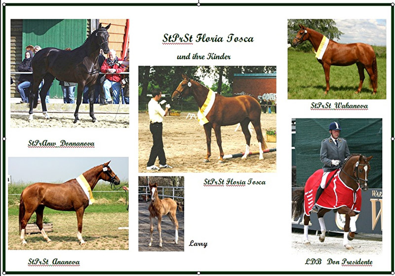 - Unter ihrem Ausbilder M.Klatt qualifizierte sich Floria tosca für das Finale um den Siegerpreis des Bezirksverbandes in Nörten-Hardenberg, dominierte die Stutenleistungsprüfung in Köchingen gegen 45 Stuten, war mit diesem Ergebnis in 2001 beste Stute im gesamten Bezirksverband Braunschweig und wurde "Beste Stute der Schau" in Königslutter am Elm. Wir sind sehr traurig, dass wir sie so früh verloren haben. In ihren hochveranlagten Kindern wird sie weiterleben. |