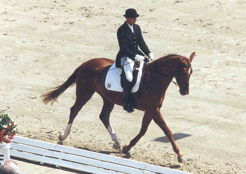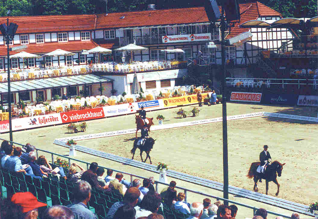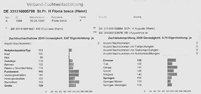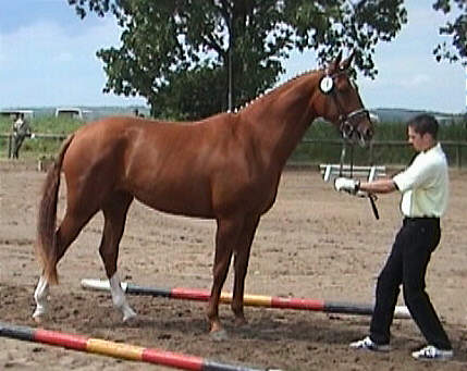 Floria tosca mit Matthias Klatt im Sattel belegte im Juni 2001 beim Finale um den Reitpferdesiegerpreis des Bezirksverbandes Hannoverscher Warmblutzüchter Braunschweig in Nörten-Hardenberg einen 6. Platz. | Floria tosca siegte in der Stutenleistungsprüfung in Köchingen mit einer Wertnote von 8,56 - hier im Fremdreitertest unter Hendrik Gäbel. Es war das beste Prüfungsergebnis des Bezirksverbandes in 2001. |