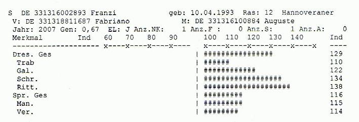 sportlichen Erfolge: Franzi siegte 1996 in Wittingen bei der Stutenleistungsprüfung ganz überlegen mit einer herausragenden Wertnote von 8,5. 3-jährig ging Franzi erfolgreich in einigen Reitpferdeprüfungen mit Ute Elendt-Meier. Sie belegte 6 mal 2., 3. und 4. Plätze und konnte sich im Finale des Bezirkschampionats in Bad Harzburg an 3. Stelle platzieren. 6-jährig