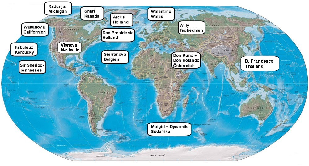 Augustehofpferde sind in der ganzen Welt geschätzt ( Nicht aufgeführt sind die Pferde, die innerhalb Deutschlands ihre Besitzer glücklich machen )